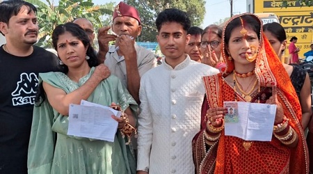 नैनीताल जिले के लाल कुआं विधानसभा क्षेत्र के दैलिया मतदान केंद्र पर एक ऐसा नजारा देखने को सामने आया जहां दूल्हा दुल्हन मतदान स्थल पर पहुंचे जहां दुल्हन ने मतदान कर इस लोकतंत्र के पर्व में अपनी भागीदारी निभाई दुल्हन ने बताया कि दे रात उसकी शादी हुई है और आज मतदान के दिन उसकी विदाई हो रही है लेकिन विदाई से पहले अपना मताधिकार का प्रयोग कर लोकतंत्र को मजबूत बनाने का काम किया है दुल्हन गायत्री चन्दोल ने बताया कि दैलिया गाँव से पली पढ़ी है और वर्तमान में वह बेंगलुरु में जॉब करती है जहां बेंगलुरु निवासी रवि शंकर त्रिपाठी से उसकी शादी हुई है और दे रात शादी समारोह के बाद विदाई से पहले मतदान स्थल पर पहुंच अपना मताधिकार का प्रयोग किया है.