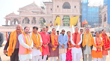 देहरादून। मंगलवार को मुख्यमंत्री पुष्कर सिंह धामी ने अपने कैबिनेट सहयोगियों के साथ अयोध्या में रामलला के दर्शन किए। इस दौरान सभी बेहद उत्साहित और भक्ति भाव में डूबे हुए नजर आए। मुख्यमंत्री पुष्कर सिंह धामी मंत्रिमंडल में अपने सहयोगियों सतपाल महाराज, प्रेमचंद अग्रवाल, सुबोध उनियाल, डॉ धन सिंह रावत, रेखा आर्य एवं राज्यसभा सांसद नरेश बंसल के साथ जॉलीग्रांट एयरपोर्ट पहुंचे, जहां से वे श्री अयोध्या धाम के लिए रवाना हुए। अयोध्या में महर्षि वाल्मीकि अंतरराष्ट्रीय हवाई अड्डा में पहुंचे पर मुख्यमंत्री श्री धामी और उनके सहयोगियों का भव्य स्वागत हुआ। इस दौरान पूरा परिसर जय श्रीराम के नारों से गूंज उठा। यहां से वह राम जन्मभूमि के लिए रवाना हुए। मुख्यमंत्री एवं उनके सहयोगी श्री अयोध्या धाम में प्रभु राम को साष्टांग नमन कर पूजा अर्चना की। दर्शन करने के बाद मुख्यमंत्री पुष्कर सिंह धामी भावुक हो गए। मुख्यमंत्री ने कहा कि श्री रामलला के दर्शन से रोम-रोम भक्तिमय और मन प्रफुल्लित है। उन्होंने कहा कि रामलला को कई वर्षों तक टेंट में रहना पड़ा। आज भव्य मंदिर में रामलाला के दर्शन किए। मैं भाव विह्वल हूं और प्रभु श्रीराम के चरणों में समर्पित हूं।