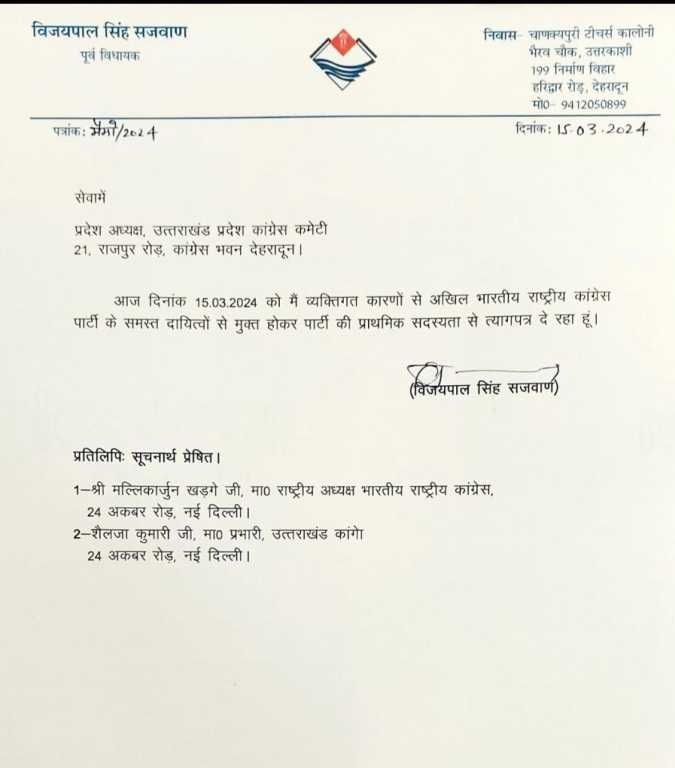 उत्तराखंड कांग्रेस (Uttarakhnad Congress) से आज की सबसे बड़ी खबर कांग्रेस के पूर्व विधायक (Congress MLA) विजयपाल सजवान ने पार्टी से दिया इस्तीफा कल बीजेपी ज्वाइन करेंगे विजयपाल सजवान गंगोत्री से विधायक (Congress MLA) रह चुके हैं विजयपाल सजवान सजवान के साथ कल एक पूर्व विधायक भी बीजेपी में शामिल हो सकते हैं।