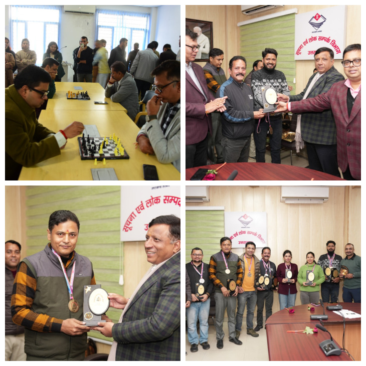 कार्यक्रम में में महानिदेशक सूचना श्री तिवारी द्वारा शतरंज प्रतियोगिता में विजयी रहे कैलाश रावत एवं उप विजेता राजेन्द्र सिंह कलूड़ा को पुरस्कृत किया गया। महिला वर्ग में कैरम सिंगल्स की विजेता श्रीमती आरती बिष्ट एवं उप विजेता सुश्री विदिशा नेगी को पुरस्कार प्रदान किये गये। कैरम प्रतियोगिता में पुरूष वर्ग के सिंगल्स श्रेणी के विजेता अतुल डिमरी एवं उप विजेता गजेन्द्र सिंह को पुरस्कृत किया गया। कैरम प्रतियोगिता के डबल्स श्रेणी में विजेता अतुल डिमरी एवं गजेन्द्र सिंह, उप विजेता चेतन कुमार पाण्डेय एवं राम सिंह परजोली को पुरस्कृत किया गया। यह खेल प्रतियोगिता विगत 12 एवं 14 दिसम्बर, 2025 को सूचना भवन सभागार में आयोजित की गई थी।