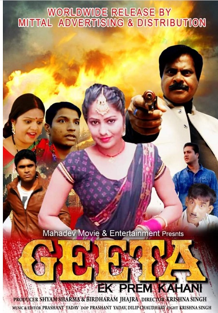 महादेव मूवी एंड एंटरटेनमेंट की नवीनतम प्रस्तुति ‘गीता- एक प्रेम कहानी’ प्रदर्शन के लिए तैयार है। बहुत जल्द ही यह फिल्म सिनेदर्शकों तक पहुँचने वाली है। श्याम शर्मा और विरधाराम झज्जर के द्वारा संयुक्तरूप से निर्मित इस फिल्म की कथावस्तु में सिनेदर्शकों के टेस्ट में आये बदलाव को ध्यान में रखते हुए रोमांस, एक्शन, कॉमेडी और ट्रेजडी का भी समावेश किया गया है।