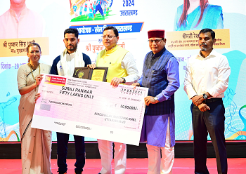 मुख्यमंत्री श्री पुष्कर सिंह धामी ने गुरुवार को बहुउद्देशीय क्रीडा भवन, परेड ग्राउंड देहरादून में राष्ट्रीय खेल दिवस के अवसर पर आयोजित कार्यक्रम में सभी को खेल दिवस की शुभकामना दी तथा हॉकी के जादूगर के चित्र पर माल्यार्पण कर उन्हें श्रद्धांजलि अर्पित की। इस अवसर पर मुख्यमंत्री ने पेरिस ओलंपिक 2024 में प्रतिभाग करने वाले उत्तराखंड के 4 खिलाड़ियों ( लक्ष्य सेन, परमजीत सिंह, सूरज पंवार, अंकिता ध्यानी ) को 50 – 50 लाख की धनराशि के चेक प्रदान किये।