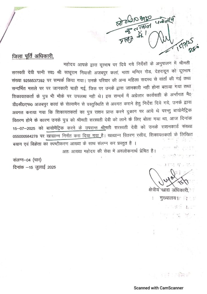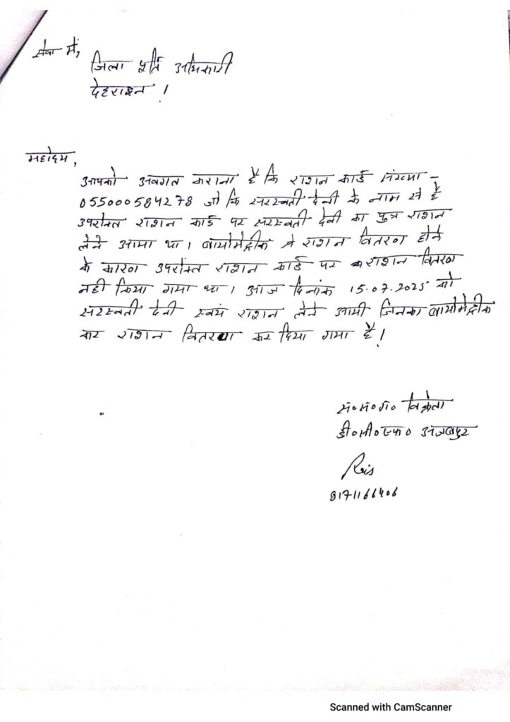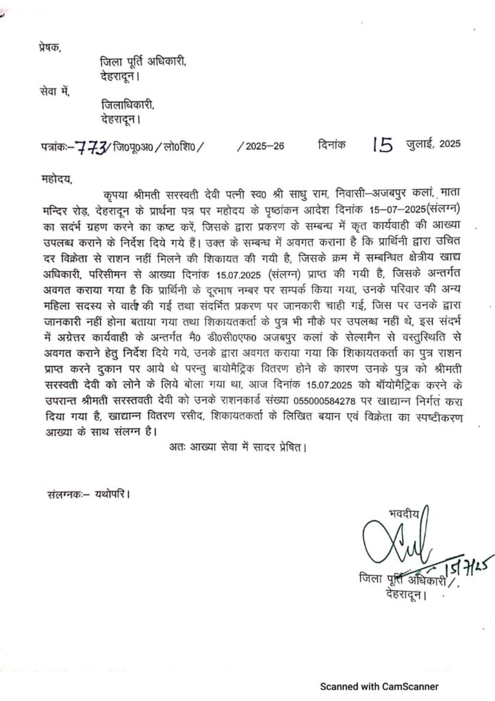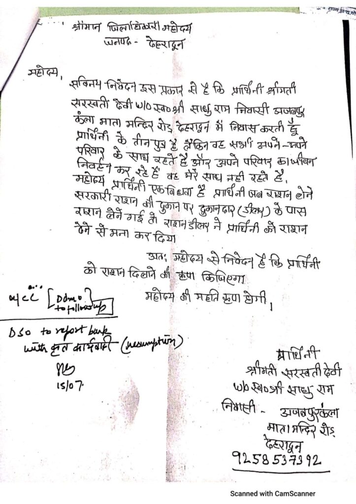 देहरादून दिनांक16 जुलाई 2025( सू वि), जिलाधिकारी सविन बंसल के सम्मुख 15 जुलाई को अजबपुर निवासी एक 72 वर्षीय बुजुर्ग महिला सरस्वती देवी ने अपनी गुहार लगाई कि पूर्ति विभाग उनका राशन देने में आनाकानी कर रहा है। बुजुर्ग सरस्वती ने जिलाधिकारी को बताया कि उनके 3 पुत्र हैं जो सभी अपने-अपने परिवार संग अलग-अलग रहते हैं। वह अपना गुजारा अपनी विधवा पेंशन से चलाती हैं। उन्होंने डीएम को बताया कि राशन डीलर पूर्ति विभाग की सूची में नाम न होने का कारण बताकर राशन नहीं दे रहा है, जबकि पूर्व में उसे राशन मिलता था। उसने डीएम से राशन दिलाने की गुहार लगाई।