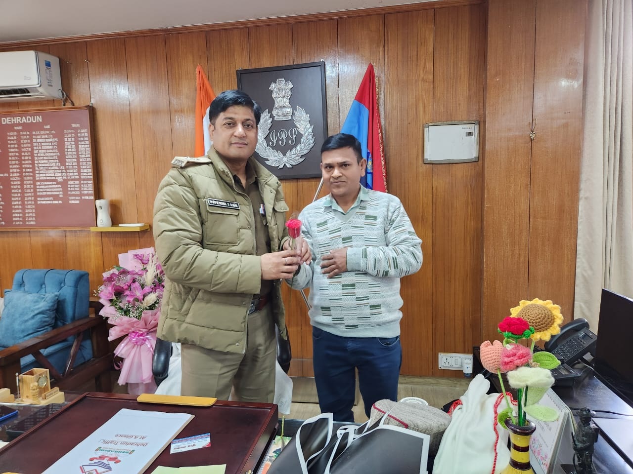 देहरादून -लघु समाचारपत्र एसोसिएशन ने नवागंतुक वरिष्ठ अधिकारियों के स्वागत की परम्परा के क्रम में आज नवागंतुक पुलिस कप्तान प्रमेन्द्र डोभाल से शिष्टाचार भेंट कर उनका जोरदार स्वागत किया गया।एसोसिएशन के कार्यकारिणी सदस्यों व पदाधिकारियों ने एसएसपी को “हैंडीक्राफ्ट ऊनी फूलों के गुलदस्ते”, हिमाचली परिधानों यथा टोपी व शाल से अभिनंदन किया गया। पत्रकारों ने फूलों के बुके, गुलाब के पुष्पों से स्वागत किया गया। अभिनन्दनीय स्वागत से अभिभूत पुलिस कप्तान ने पत्रकारों के साथ समन्वय बनाए रखने का भरोसा दिलाया। मृदुभाषी, मिलनसार पीआरओ हेमंत खंडूड़ी को भी पुष्प भेंट किया गया।